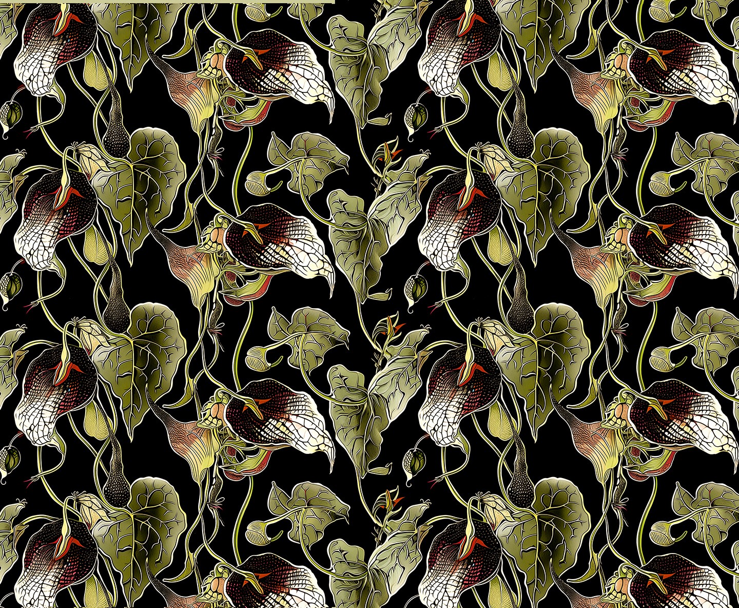 BLACK FIG is an innovative surface design by Elisabeth Trostli, featuring an intricate allover pattern of stylized figs, tendrils, and leaves. The background showcases the colorful foliage against a black backdrop.