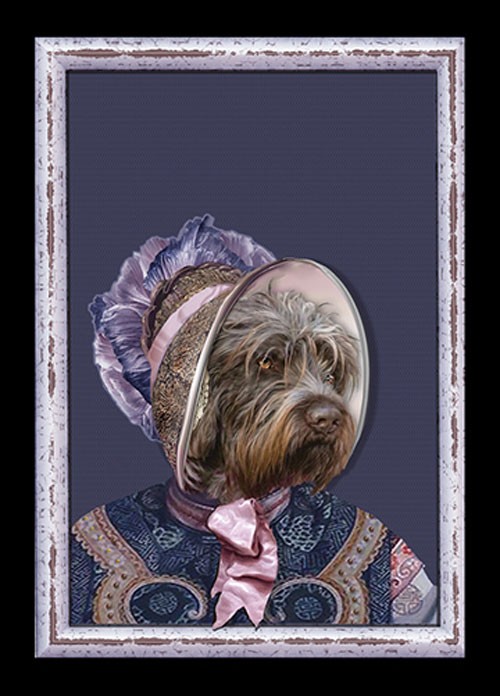 Today he is posing for his portrait in an antique pink and blue bonnet with a satin ribbon at his throat, feeling a little bashful.