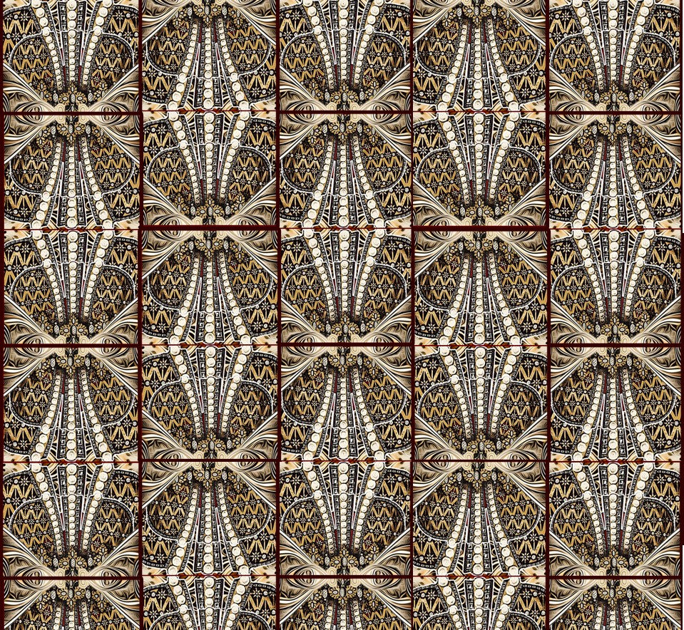 This decorative design draws inspiration from fractals, paisley, damask, and Islamic tiles. The pattern exudes an elegant Art Deco aesthetic and is versatile enough for use on textiles, wallpaper, rugs, stationery, and giftware.
