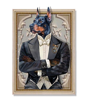 DR. PINSCHER, a black Doberman Pinscher, the proud father, wears a formal vintage tuxedo with white tie and French cuffs. On his satin lapel is a gold locket pin, open to show the miniature painting of his puppy - Mini Pin. Standing in front of an ornate background, he waits for his portrait by a famous Old Master painter. Dr. Pinscher is framed by a white and gold-washed frame.