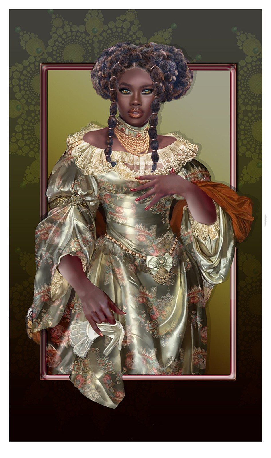 Melissa, Duchess in the Royal House, (a.ka. THE GILDED CAGE) is dressed a jewelled, lace-bordered satin gown as she she poses for her portrait by a famous Old Master painter. She has removed one white glove as a subtle signal that she is ready for the next palace confrontation.