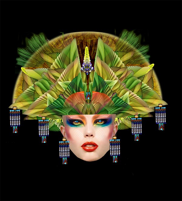 The Lupine Masque takes inspiration from the enchanting blue lupine flower, serving as the focal point of this imaginative Egyptian headdress. Adorned with vibrant hues, this stylish woman wears bold makeup that complements the contrasting colors of her headdress. Delicate turquoise beaded dangles cascade gracefully from the crown, their luminosity enhanced against the profound black backdrop.