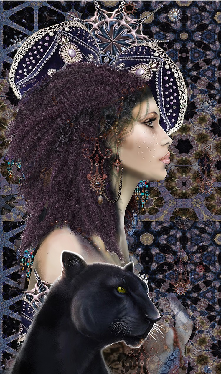 She is shadowed by her pet black Panther, as she poses for a portrait by a famous Old Master painter. Her prophetic powers are