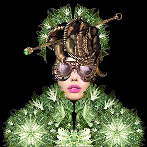 rose cabbage. She sports a unique style, viewing her world through green-tinted aviator goggles. Within this precisely crafted symmetrical composition,