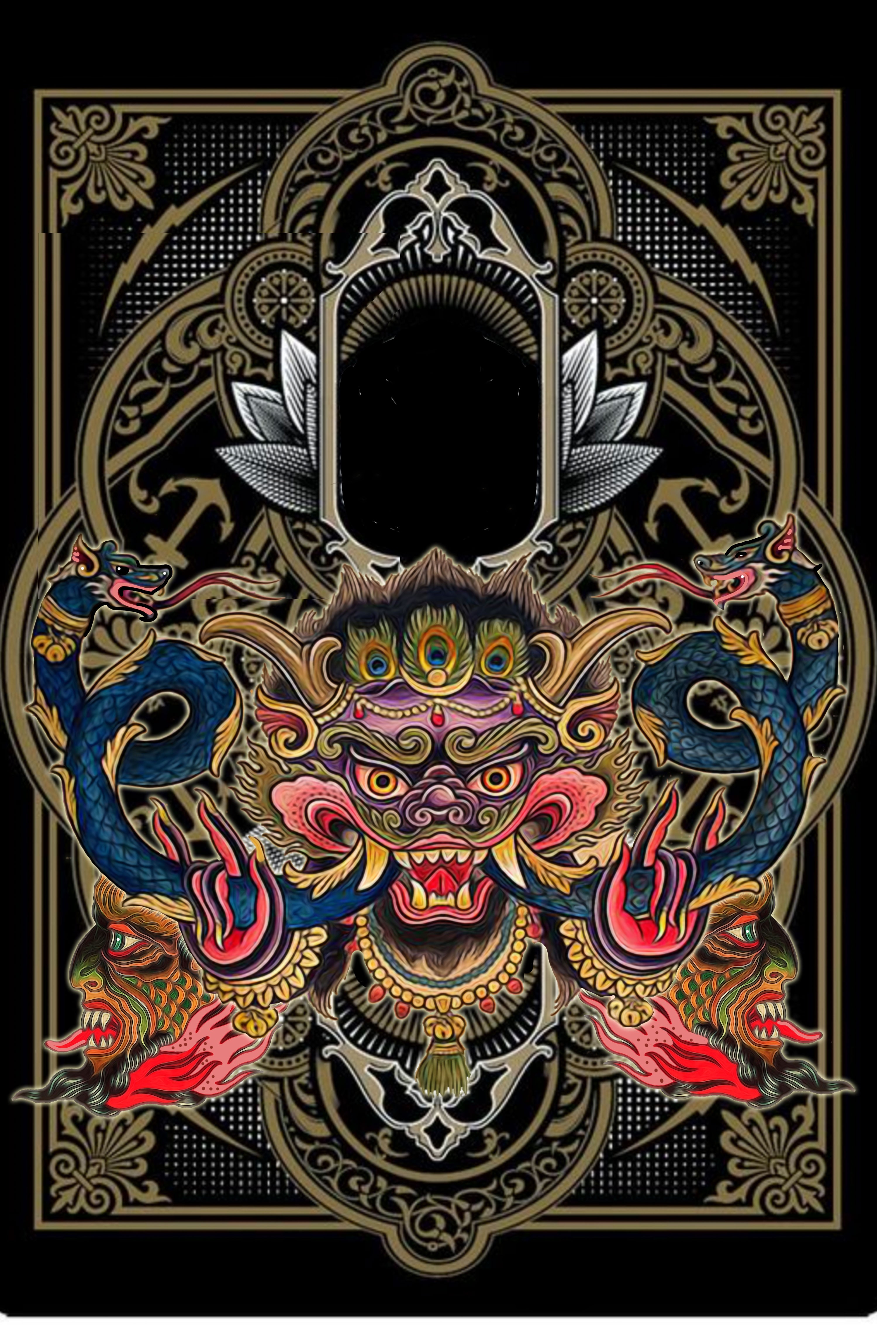 Siamese Devil 7 : A symmetrical tattoo concept features a Siamese temple demon at its center, grasping crowned blue serpents in its clawed hands. Two horned, grinning demons flank its head on either side, contributing to a well-balanced composition. The backdrop design draws inspiration from an Art Deco pattern found on the back of a playing card.