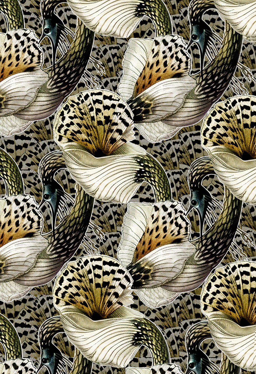 SWAN FLOWERS is an innovative surface design by Elisabeth Trostli. It features an intricate allover pattern of stylized white swan-shaped "Aristolochia" flowers against a textured background.