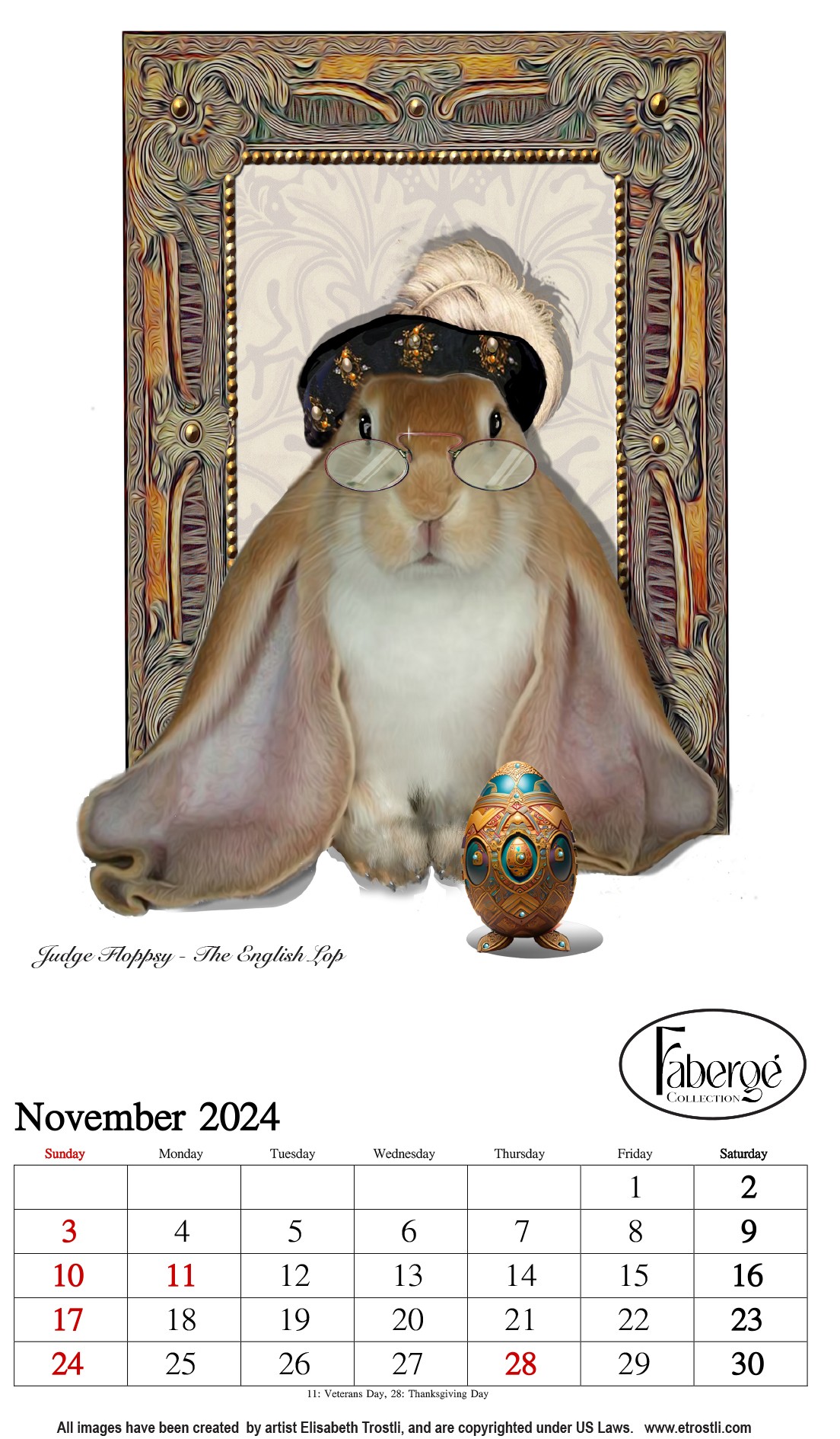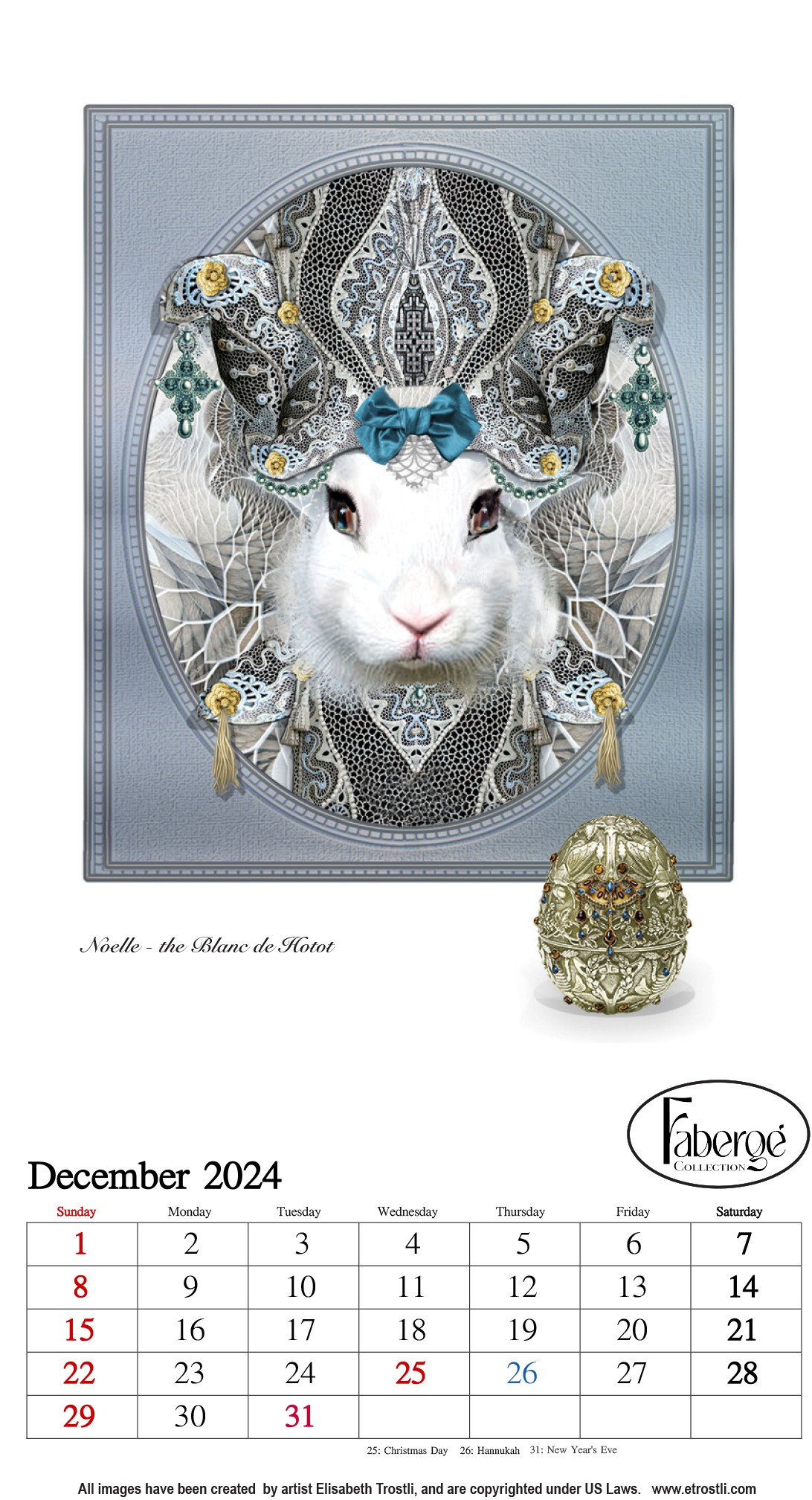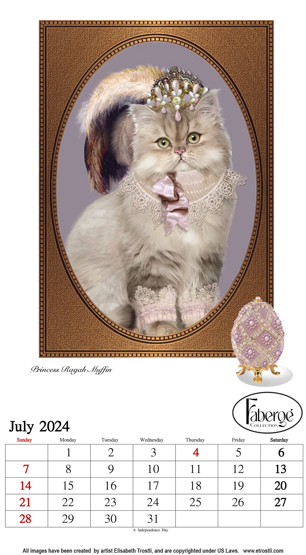 A unique calendar composed of 12 unique, adorable bunnies, cats and kittens dressed in period costumes and hats, digitally illustrated by Elisabeth Trostli.