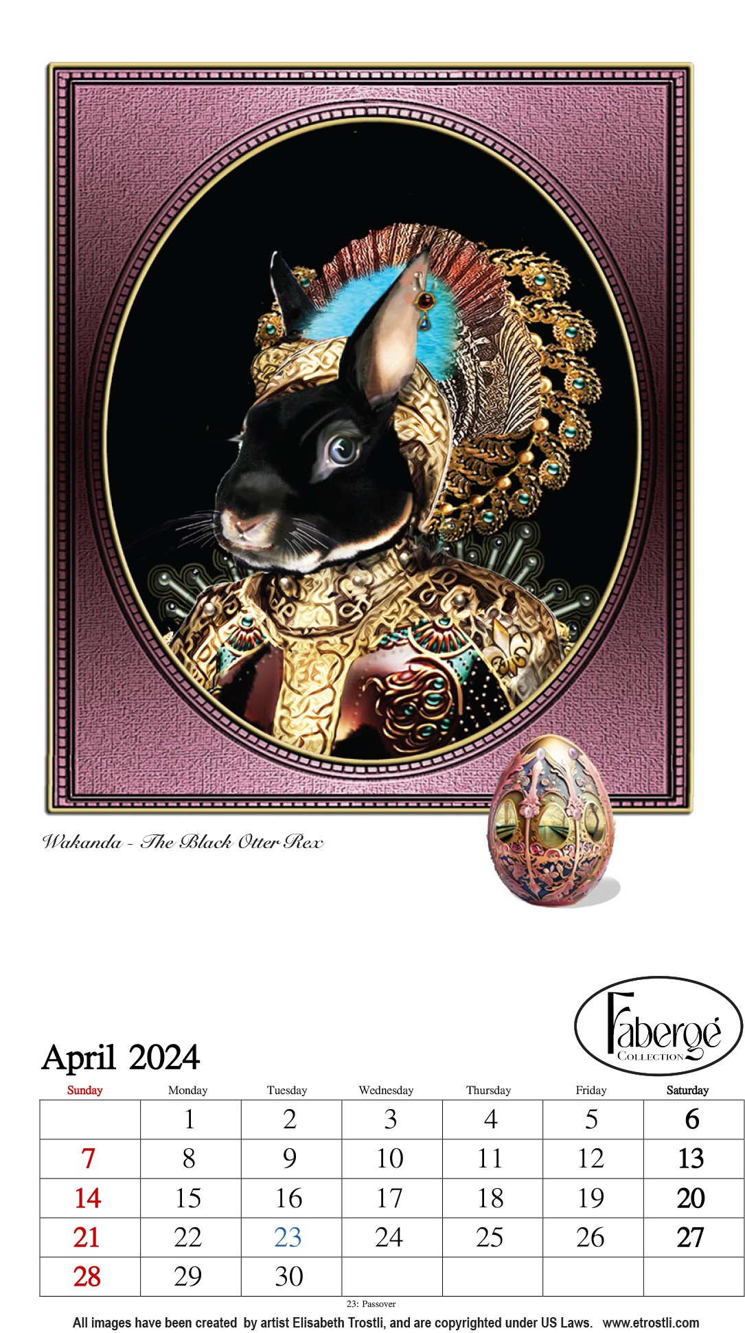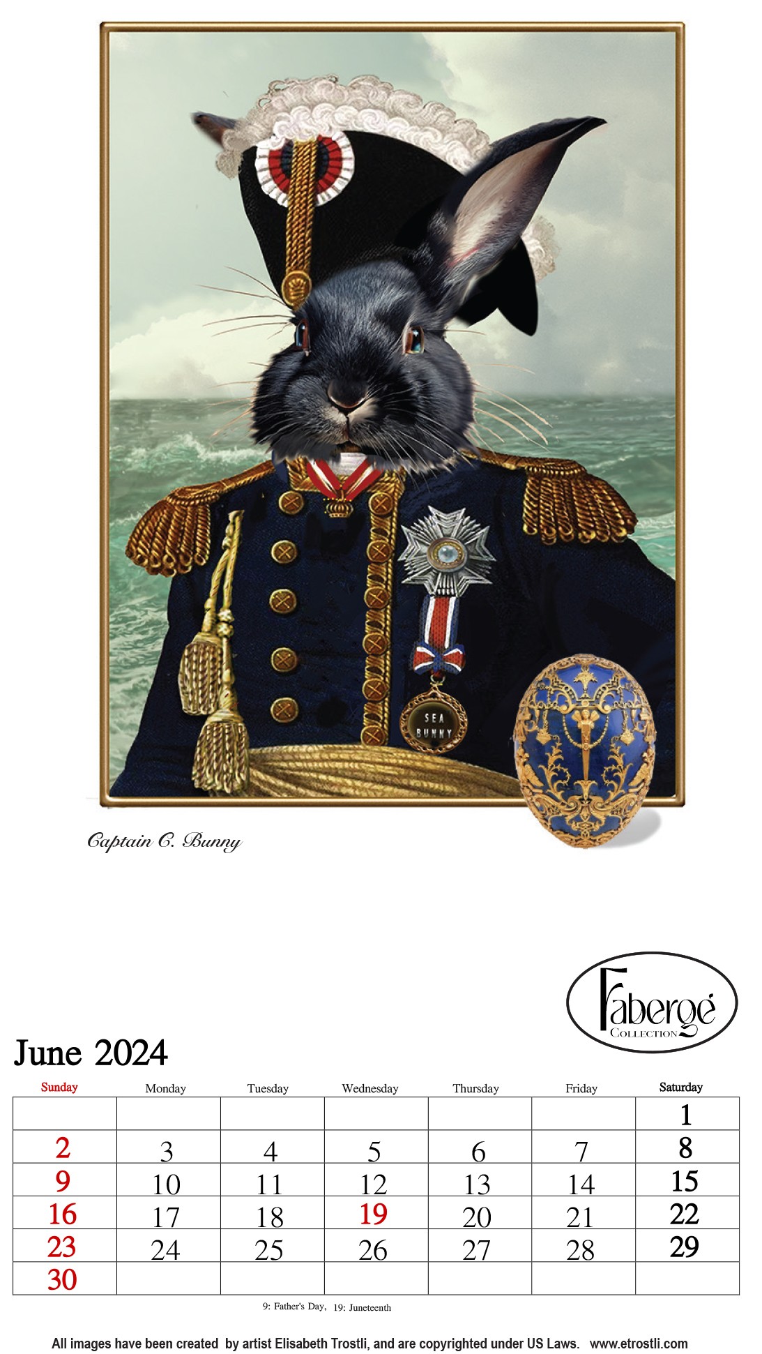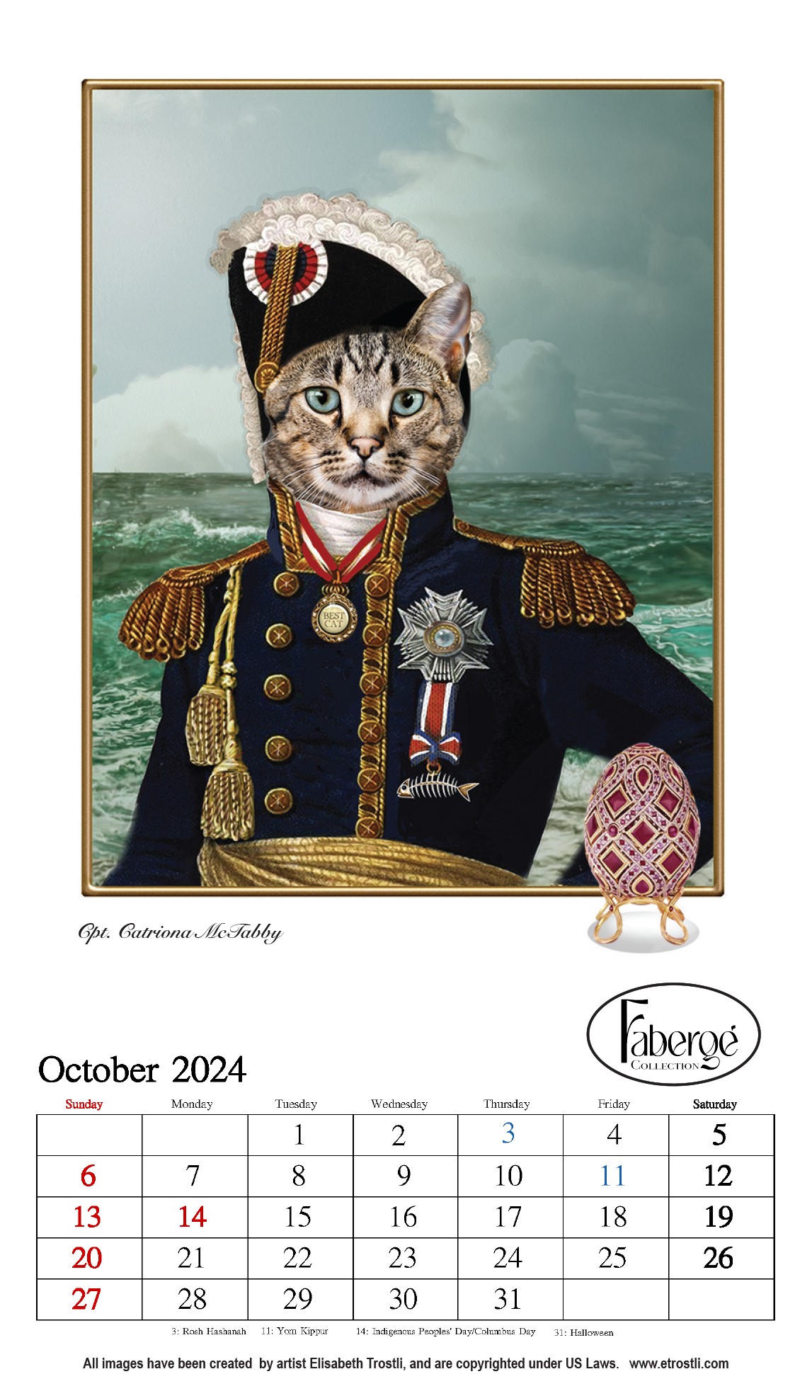 A unique calendar composed of 12 unique, adorable bunnies, cats and kittens dressed in period costumes and hats, digitally illustrated by Elisabeth Trostli.